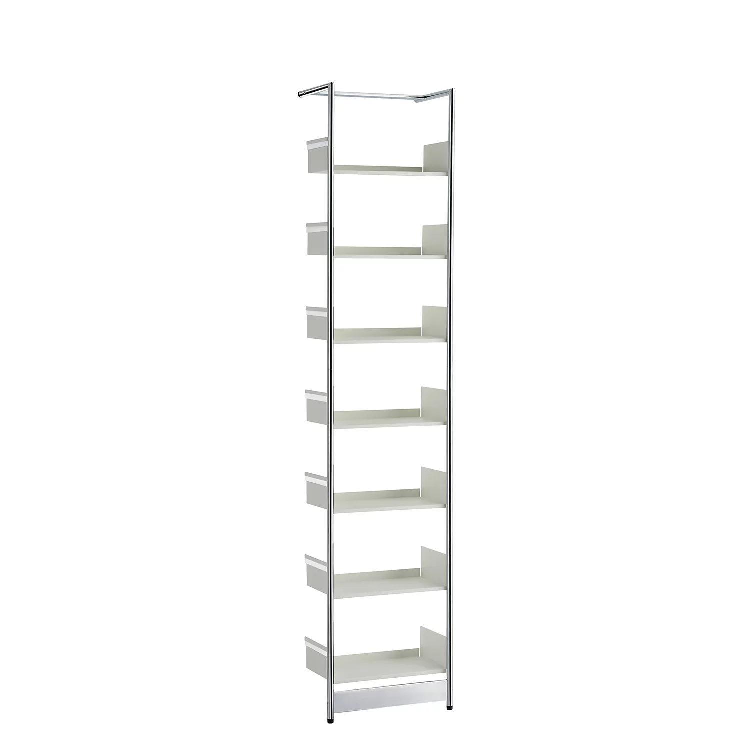 Medium Pool ist mit sieben Tablaren ausgestattet und schafft vielen Dingen Platz, zum Beispiel Büchern, Videokassetten, Vasen und mehr. Das Regal kann ohne Montage an jede Wand angelehnt werden. Die Seitenteile sind aus verchromtem Stahlrohr gefertigt, die Tablare aus 1-mm-Stahlblech.