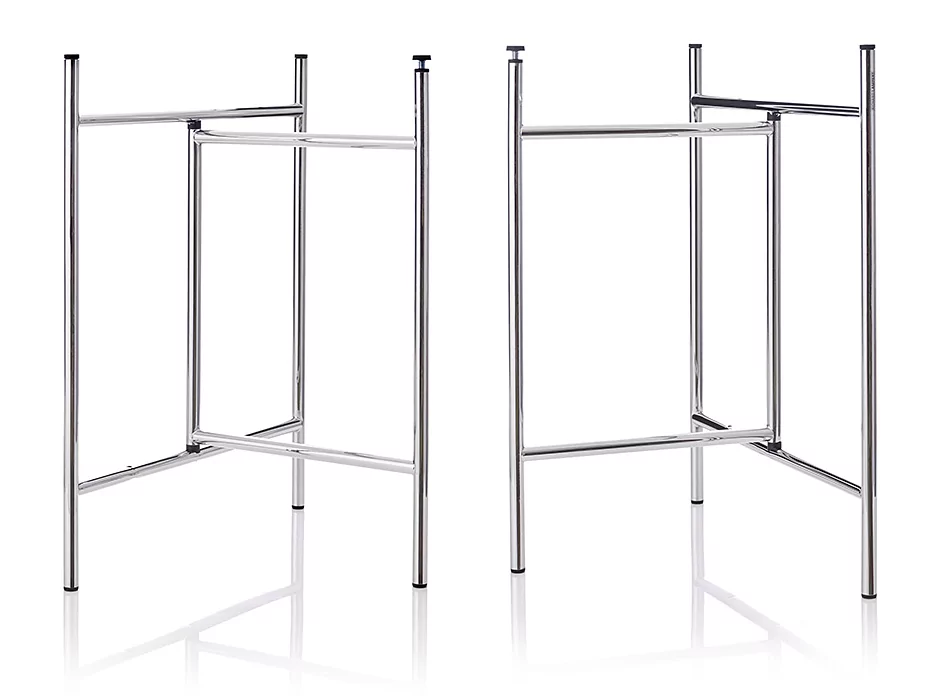 Inspiriert vom Tischgestell Egon Eiermanns aus dem Jahr 1953 hatte der Designer Alexander Seifried 2014 die Idee zu einem neuen Gestell dem Klappbock Eiermann 3. Mit großem Respekt vor dem Erfindungsreichtum des Architekten Eiermann nahm Seifried die originalen Seitenrahmen des Tischgestells und ergänzte diese mit langen Auslegern, die mittig oder exzentrisch montiert werden können – je nachdem, ob Sie den Tisch von ein oder zwei Seiten nutzen und die Beinfreiheit entsprechend verteilen wollen.